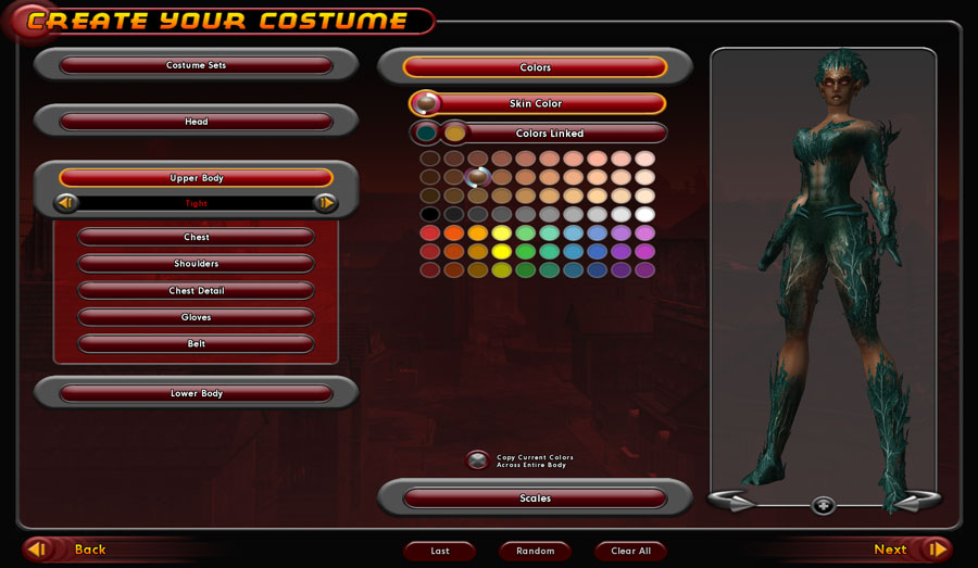 To coordinate your costume easily, use the Copy Current Colors button. This makes your entire costume conform to the two colors currently selected. If you want to color each piece of your outfit differently, make sure this option isn't selected.